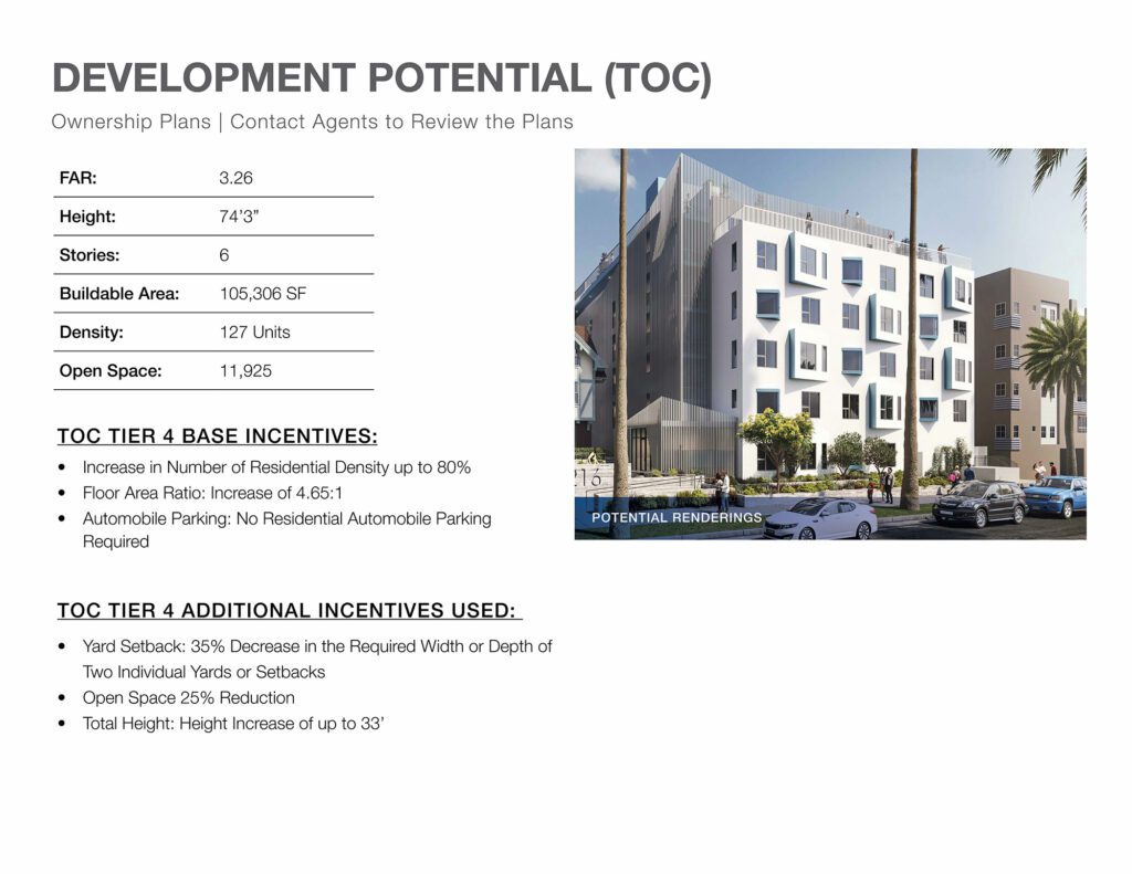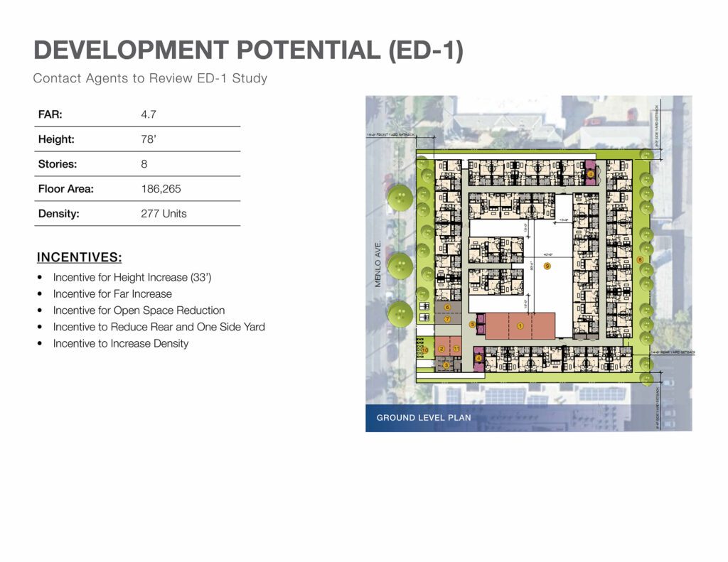 The offering features Ready-To-Issue plans for a 100% affordable TOC project featuring 127 units. The unit mix includes 23 singles, 40 one-bedrooms, 32 two-bedrooms, 32 three-bedrooms along with approximately 5,500 SF of space in a new standalone building for service amenities. Alternatively, the potential for unlimited density is achievable via AB 2345, alongside an expedited entitlement process through Executive Directive 1, should a 100% affordable housing project be pursued. A preliminary feasibility study for 277 units under an ED1 entitlement strategy is available (Contact Agents for Details).