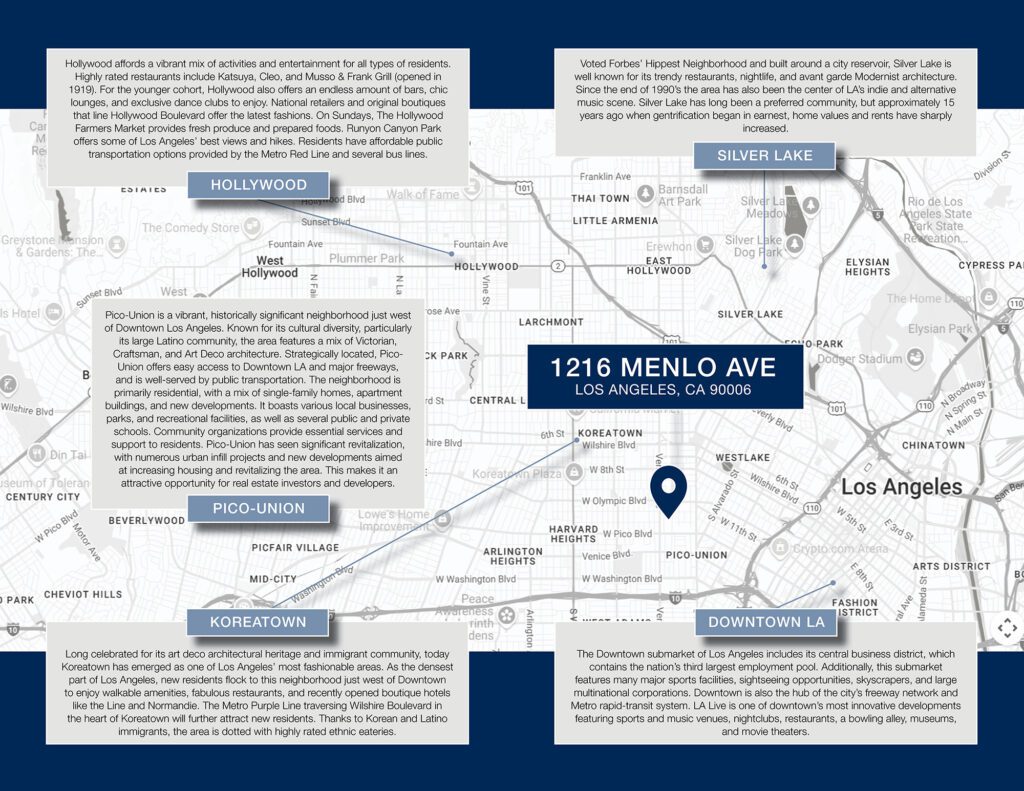 The Neema Group is pleased to present a development opportunity at 1216 Menlo Ave in the Pico-Union neighborhood of Los Angeles, strategically situated between W Pico Blvd and W Olympic Blvd. The lot totals 39,995 SF and is zoned R4-1VL in a Tier 4 TOC. The existing improvements compromise of two separate structures, which will be delivered vacant at the close of escrow.