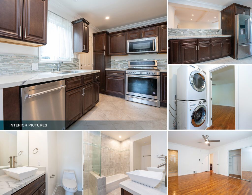 The property features five spacious units, three 1+1.5’s and two 2+2’s with 12 parking spaces, including three double garages; three units have been extensively renovated with in-unit washers and dryers, recessed lighting, new double-pane windows, base moldings, hardwood floors, stainless-steel appliances, custom dark wood cabinetry, double sink vanities, tile showers with separate tubs, central heat and air, and new electrical and plumbing